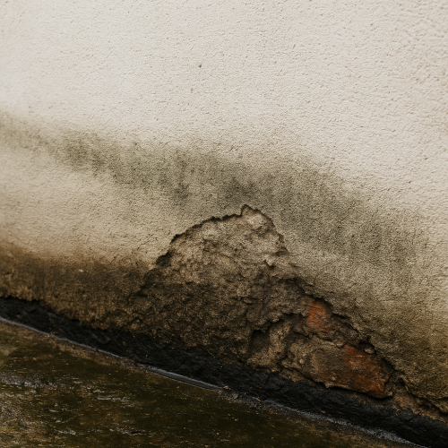 - Le sol/voirie qui remonte trop haut contre la façade (remblais, plantations, absence de rejets) : le mur subit une pression d’eau prolongée.